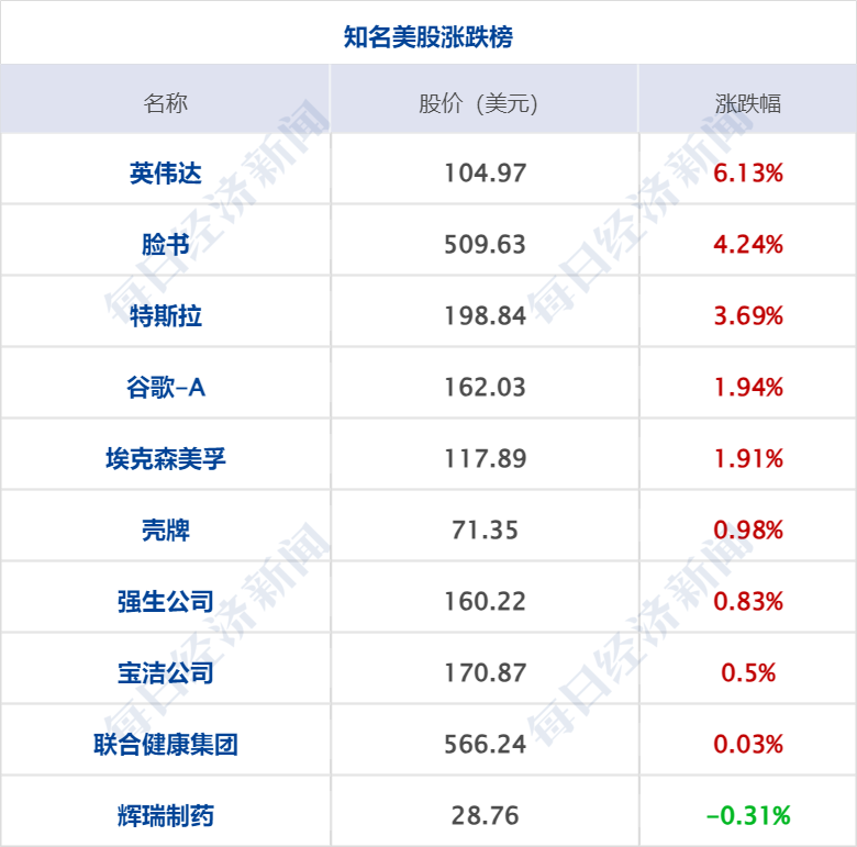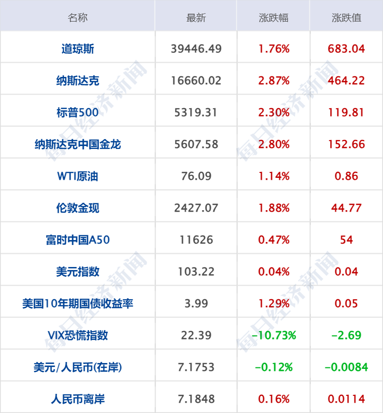 美股三大指数集体收涨,道指涨683.04点,涨幅1.76%;纳指涨464.21点,涨幅2.87%;标普500指数涨2.3%,创2022年11月以来最大单日涨幅;大型科技股普涨,英伟达涨超6%,Meta涨超4%,特斯拉涨超3%,苹果、微软、亚马逊、谷歌涨超1%。半导体、航空公司、有色金属板块涨幅居前,Arm涨超10%,安森美半导体涨超8%,英特尔涨近8%,博通、恩智浦涨近7%,美国航空、达美航空、联合大陆航空涨超6%,高通、AMD、世纪铝业涨超5%,戴尔科技涨超4%,超微电脑、惠普、南方铜业涨超3%。中概股普涨,纳斯达克中国金龙指数涨2.8%。百度涨超5%,蔚来涨超4%,微博、小鹏汽车、唯品会、阿里巴巴涨超3%,理想汽车、京东、富途控股、网易、腾讯音乐涨超2%,满帮涨超1%,爱奇艺小幅上涨。