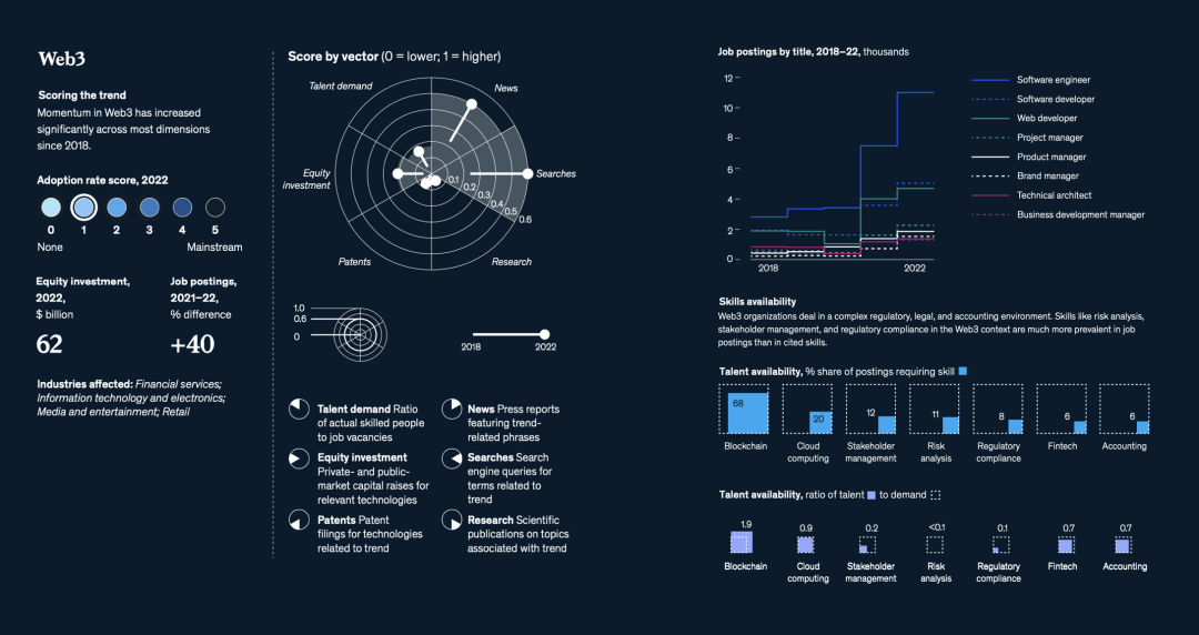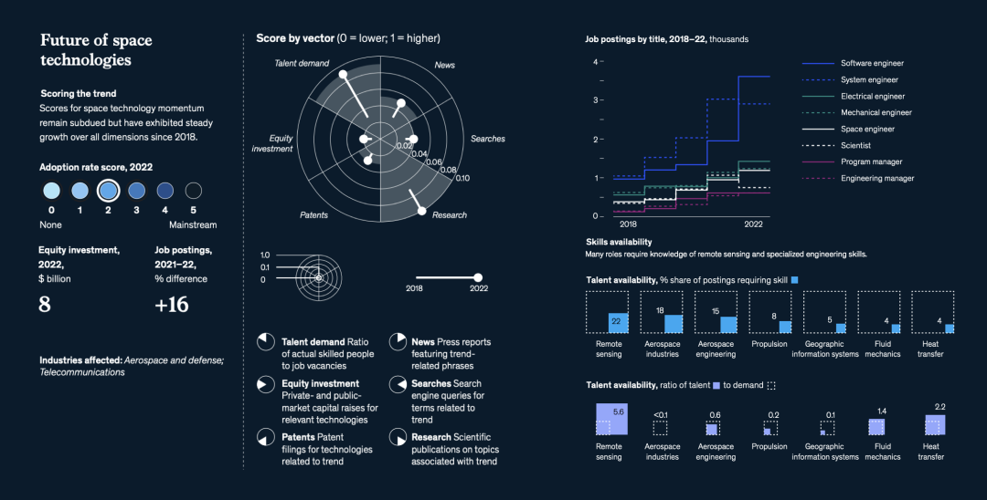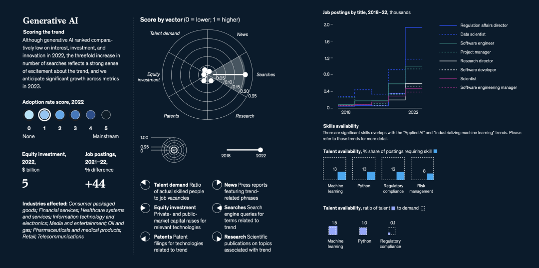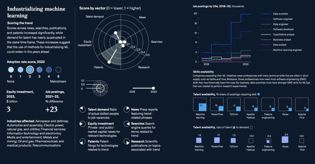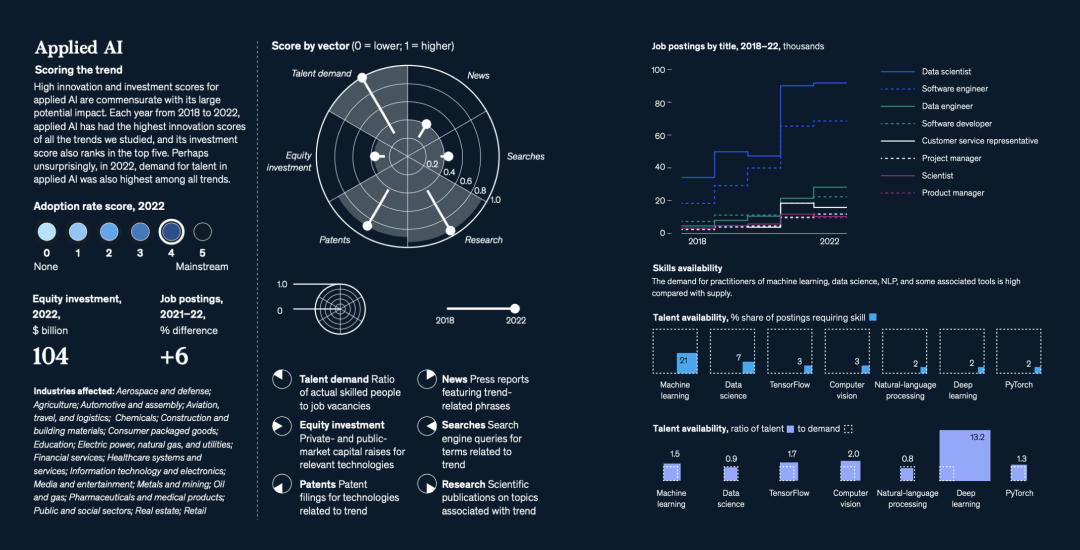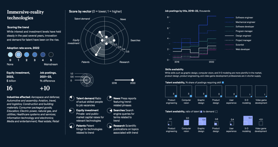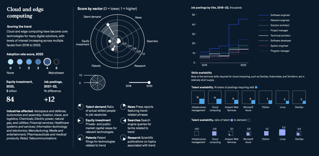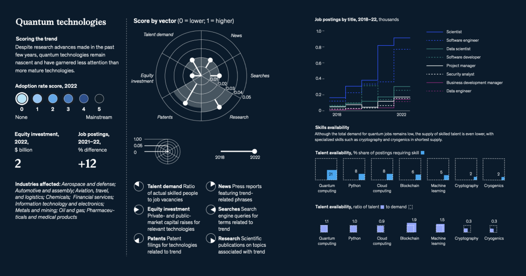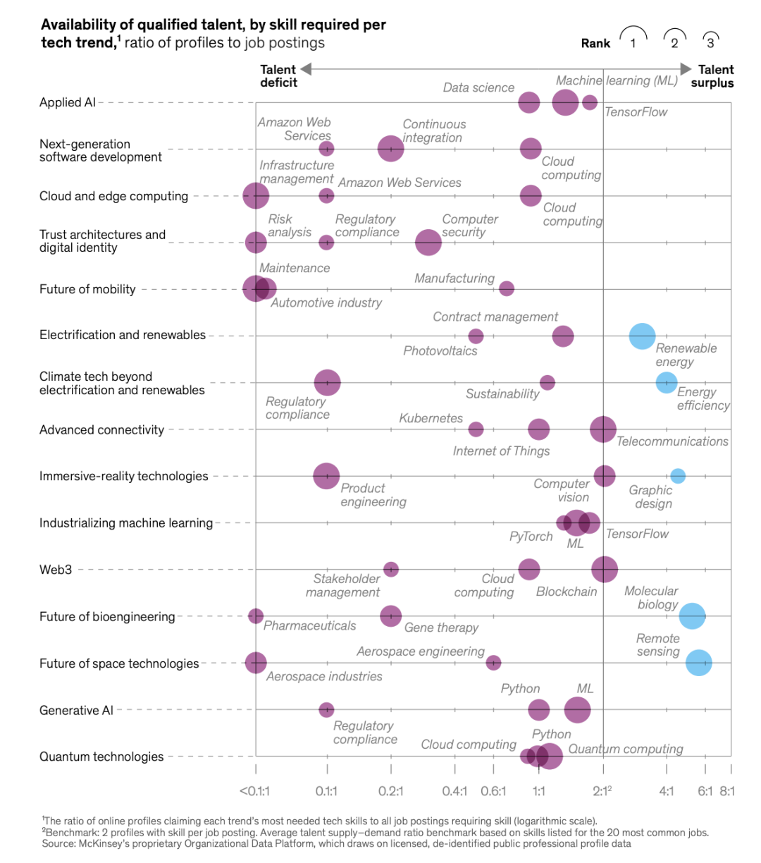 与往年不同的是,麦肯锡增加了一个重要的新分析维度——人才(talent)。人才的重要性不用赘述——人才短缺是创新与增长的头号敌人。数据显示,与2021年相比,2022年全球职位发布总体上减少了13%,但与文中提到的15个科技趋势相关的领域的职位发布在2022年增长了15%。麦肯锡对这些技术趋势中的350万个职位发布进行了调查,发现许多最需求的技能,每个职位的合格从业者数量还不到全球平均水平的一半↓
