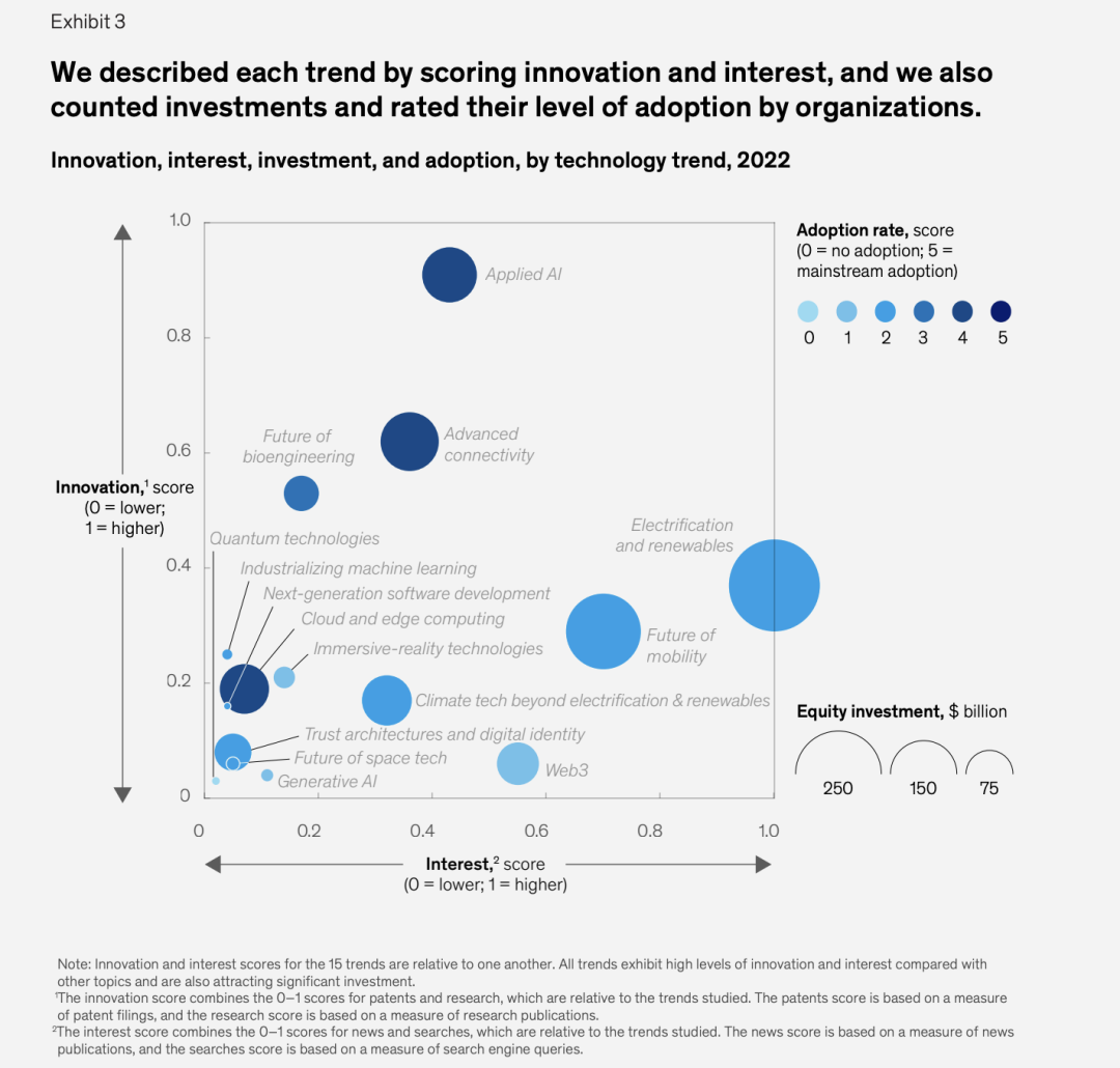 为了评估每个趋势的动力(momentum),报告考察了其关注度(interest)、创新性(innovation)和资本(investment)等定量指标,同时,鉴于这些趋势的长期性和相互依赖性,麦肯锡还深入研究了每个趋势背后的底层技术、不确定性、未来挑战等。