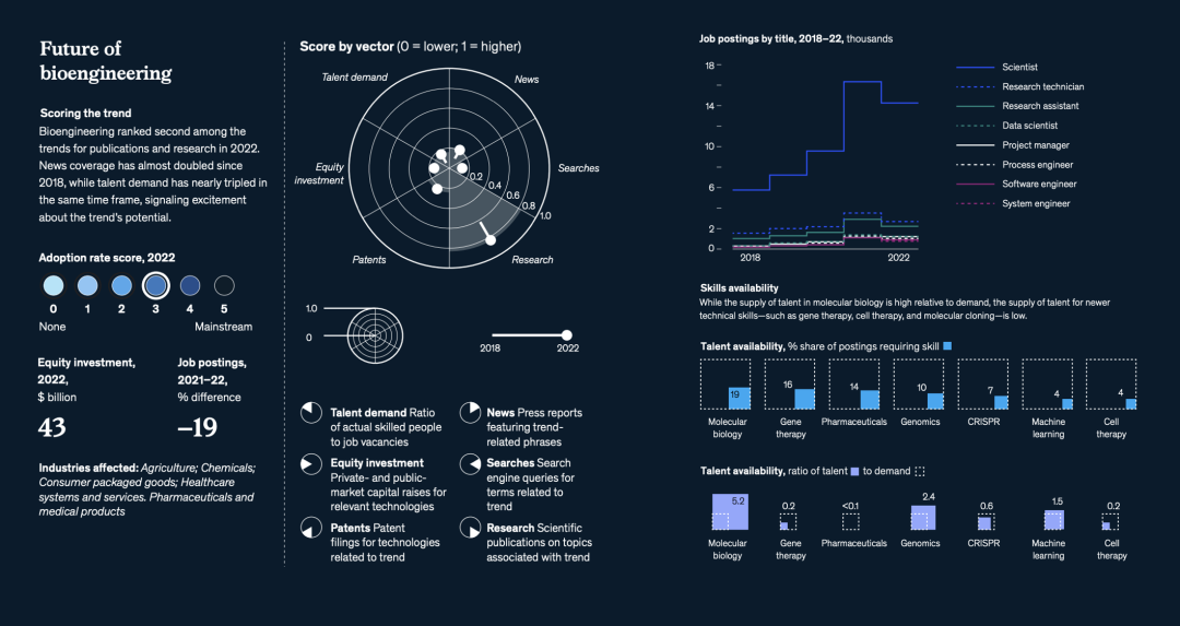 生物学的突破性发展,结合数字技术的创新,有望帮助组织应对医疗保健、食品农业、消费品、可持续发展以及能源和材料生产等领域的需求,创造新的产品和服务。麦肯锡的研究表明,目前400种生物工程的应用案例在科学上都是可行的,预计从2030年到2040年,这些用例将产生2万亿到4万亿美元的经济影响。