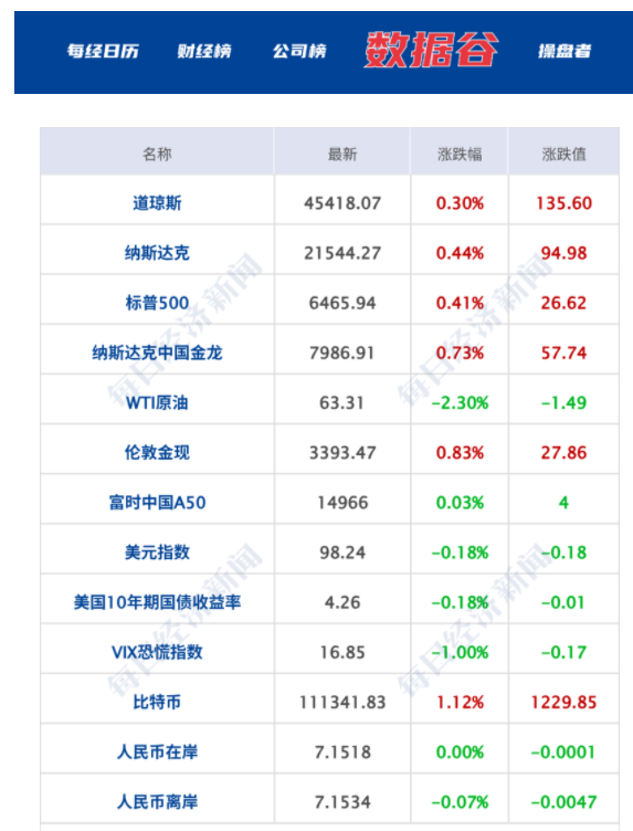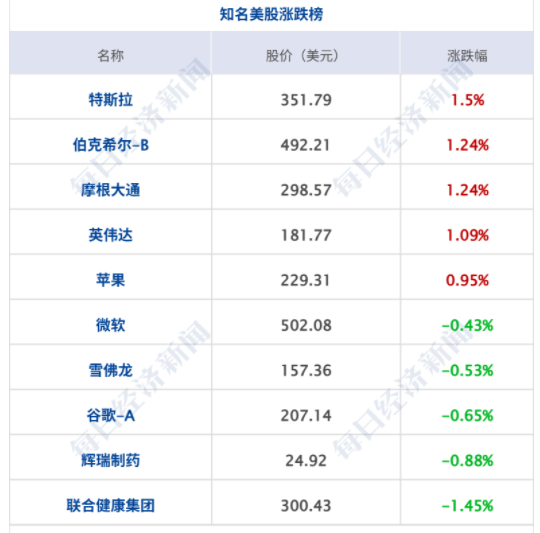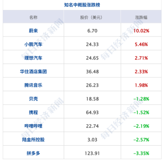 美股低开高走,三大指数均小幅收涨,纳指涨0.44%,标普500指数涨0.41%,道指涨0.3%;大型科技股多数上涨,特斯拉、英伟达涨超1%,苹果、奈飞、亚马逊、Meta小幅上涨;谷歌、微软、英特尔小幅下跌。中概股多数上涨,纳斯达克中国金龙指数涨0.72%,禾赛涨逾14%,蔚来涨10%,小鹏汽车涨超5%,理想汽车涨近3%。