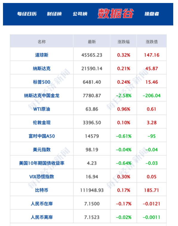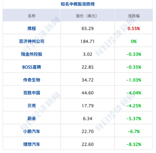 美股三大指数均小幅收涨,道指涨0.32%,标普500指数涨0.24%,纳指涨0.21%;大型科技股多数上涨,英特尔涨超2%,苹果、谷歌、微软、亚马逊小幅上涨;特斯拉、奈飞、Meta小幅下跌。中概股普跌,纳斯达克中国金龙指数跌2.58%;老虎证券、阿特斯太阳能跌超9%,理想汽车跌逾8%,小鹏汽车跌近7%,蔚来跌近6%,晶科能源跌近5%,京东跌超3%,百度、大全新能源跌近3%,阿里巴巴跌1.6%。