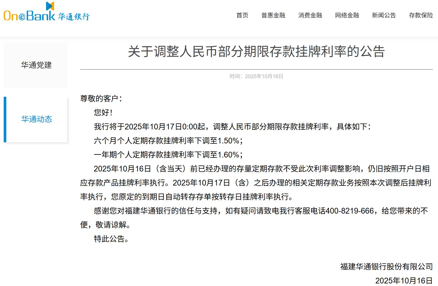 10月16日,福建华通银行发布公告称,我行将于2025年10月17日0:00起,调整人民币部分期限存款挂牌利率,具体如下: