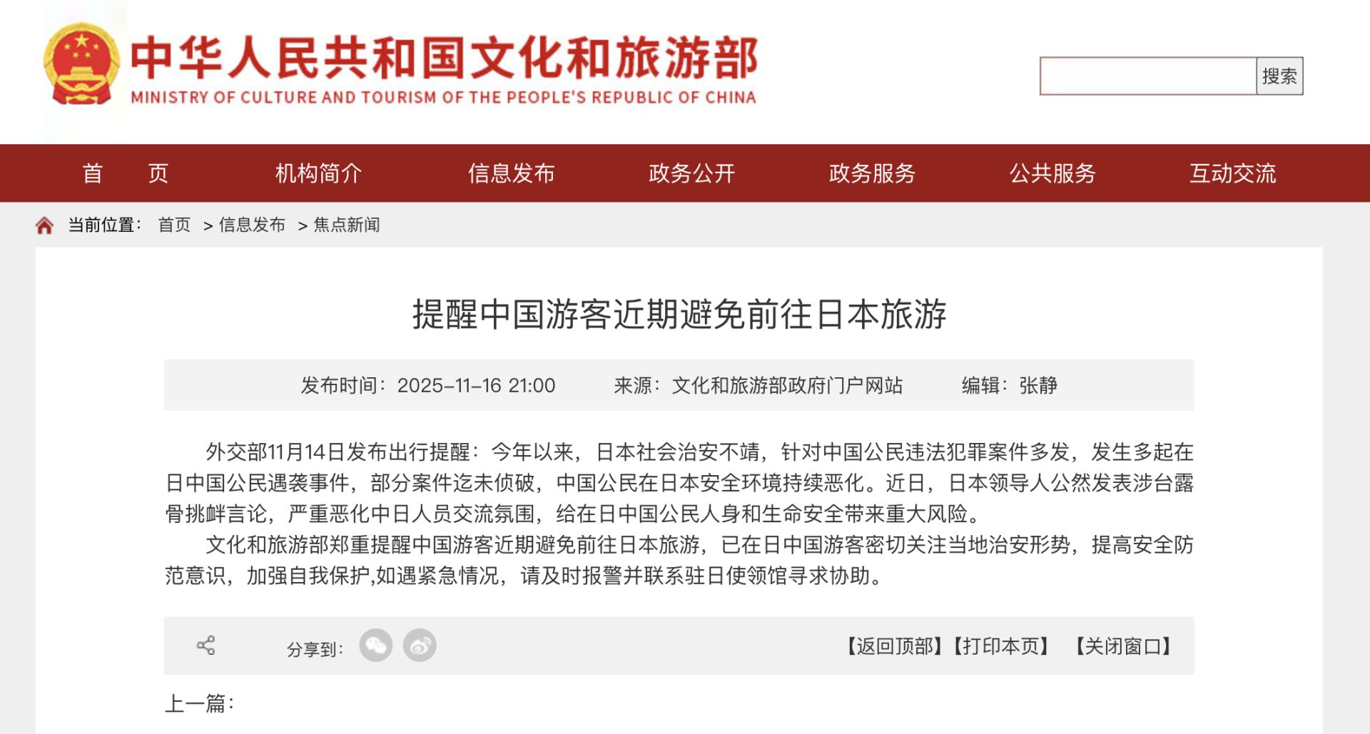 文化和旅游部郑重提醒中国游客近期避免前往日本旅游,已在日中国游客密切关注当地治安形势,提高安全防范意识,加强自我保护,如遇紧急情况,请及时报警并联系驻日使领馆寻求协助。
