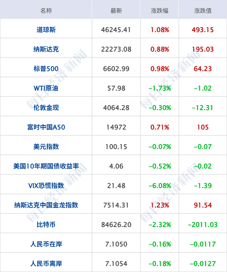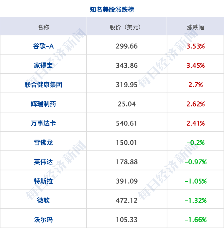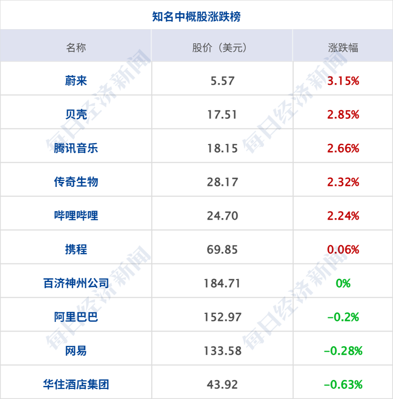 美股三大指数集体收涨,道指涨1.08%,标普500指数涨0.98%,纳指涨0.88%;大型科技股涨跌互现,谷歌涨超3%,英特尔涨超2%,苹果、亚马逊涨超1%,甲骨文跌超5%,奈飞、微软、AMD、英伟达、特斯拉跌超1%。中概股多数上涨,纳斯达克中国金龙指数涨1.23%;蔚来涨超3%,哔哩哔哩、理想汽车涨超2%,京东、小鹏汽车涨超1%。