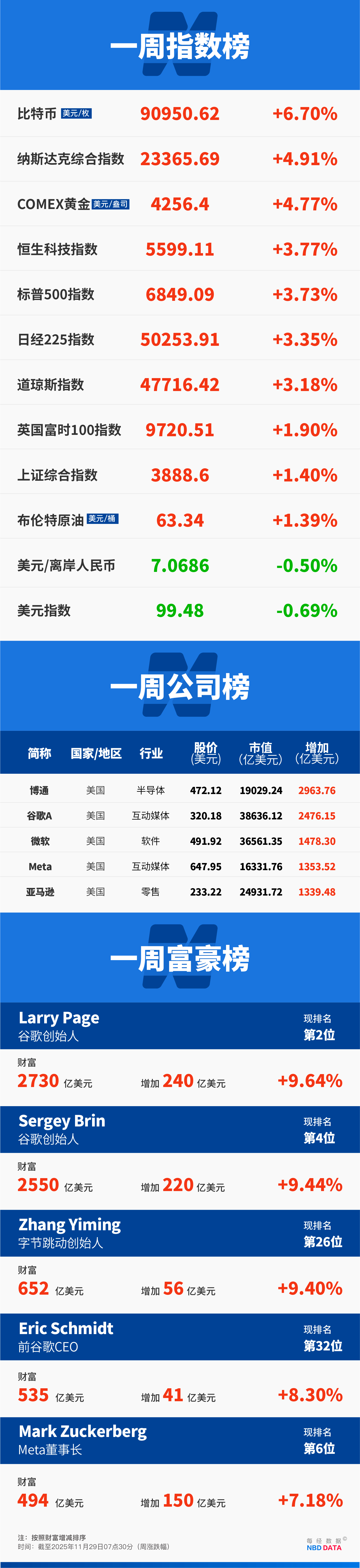 大宗商品方面,金属价格周五飙升,白银和铜均创下纪录新高。现货白银价格突破每盎司56美元,伦敦期铜一度上涨2.5%,触及纪录新高每吨11210.50美元。11月,现货白银累涨15.25%,连续七个月上涨。分析认为,由于市场对美联储在12月降息的预期升温、资金流入以实物白银为支撑的ETF,再加上供应持续紧张,使白银价格获得了强劲支撑。