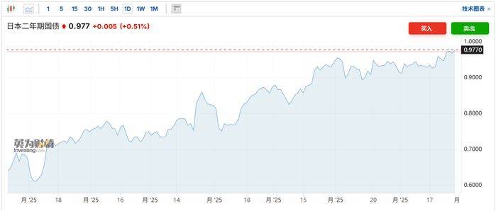 另一个需求疲软的信号是尾部差价(平均中标价格与最低中标价格之差)达到0.012,而10月的前次拍卖仅为0.002。受此消息影响,日本两年期国债小幅下跌,收益率升至0.977%,创2008年以来的最高水平。