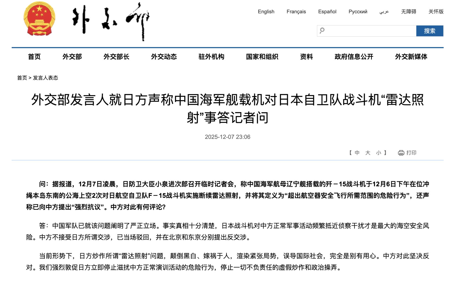 问:据报道,12月7日凌晨,日防卫大臣小泉进次郎召开临时记者会,称中国海军航母辽宁舰搭载的歼-15战斗机于12月6日下午在位冲绳本岛东南的公海上空2次对日航空自卫队F-15战斗机实施断续雷达照射,并将其定义为“超出航空器安全飞行所需范围的危险行为”,还声称已向中方提出“强烈抗议”。中方对此有何评论?