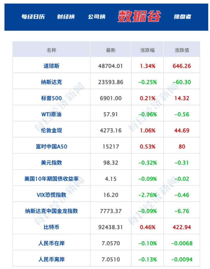 美股三大指数收盘涨跌不一,道指涨1.34%,纳指跌0.25%,标普500指数涨0.21%,大型科技股多数下跌,甲骨文跌超10%,谷歌跌超2%,特斯拉、英伟达跌超1%;贵金属、金属原材料大涨,Vista黄金涨超15%,赫克拉矿业涨超12%,世纪铝业涨超6%;加密货币、半导体板块走低,Robinhood跌超9%,Arm、英特尔跌超3%,Coinbase跌超2%。纳斯达克中国金龙指跌0.09%,中概股涨跌不一,蔚来涨近2%,百度、世纪互联涨超1%,阿里巴巴、知乎、哔哩哔哩跌超1%,小鹏汽车跌超2%。