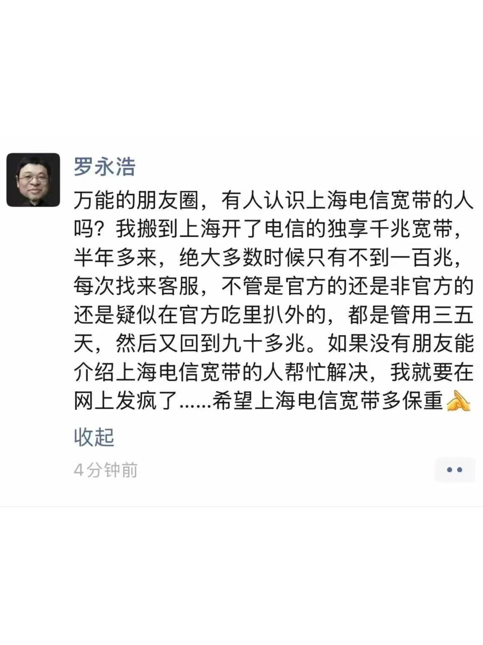 最近,罗永浩在朋友圈公开吐槽上海电信。