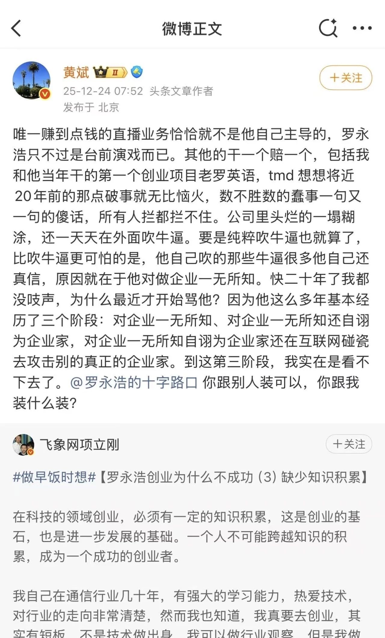 黄斌解释道,自己忍了这么多年现在才出来骂老罗的原因是,他不仅一无所知还要自诩为企业家,甚至在互联网碰瓷去攻击别的真正的企业家。疑似是看不下去前段时间引发热议的罗永浩攻击华与华华杉事件。