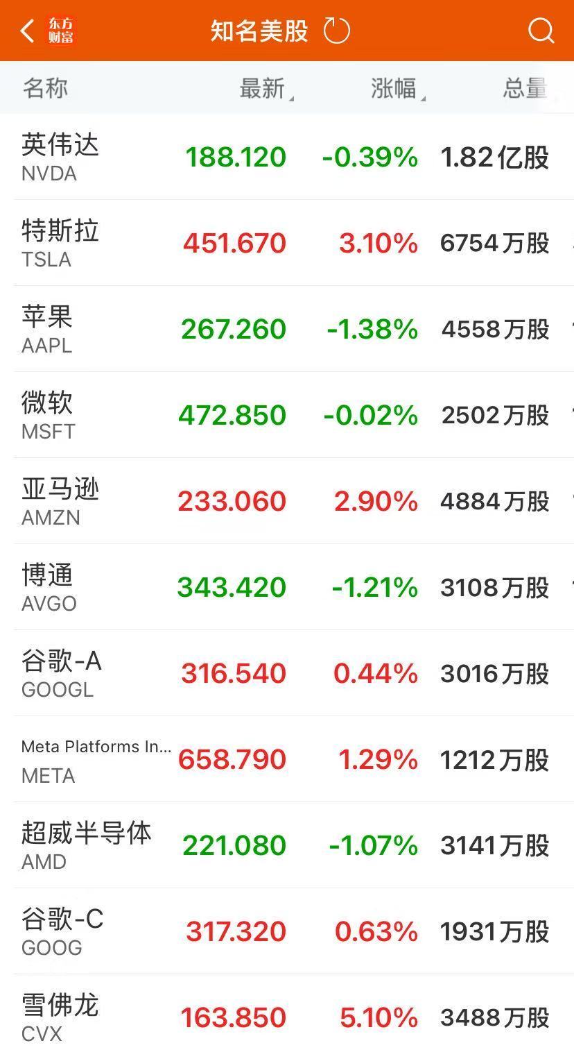 大型科技股多数上涨,特斯拉涨3.10%,亚马逊涨2.9%,Meta涨1.29%,谷歌A涨0.44%,微软则收跌0.02%,英伟达跌0.39%,苹果跌1.38%。