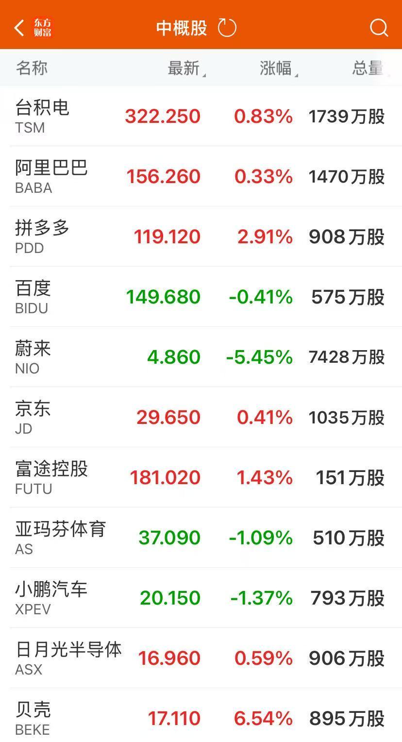 热门中概股多数上涨,纳斯达克中国金龙指数涨0.49%。贝壳涨超6%,哔哩哔哩、腾讯音乐涨超3%,满帮、霸王茶姬等涨超2%,金山云、富途控股等涨超1%,唯品会、携程网等小幅上涨;蔚来跌超5%,万国数据、百胜中国跌超1%,小鹏汽车、新东方等跌超1%。