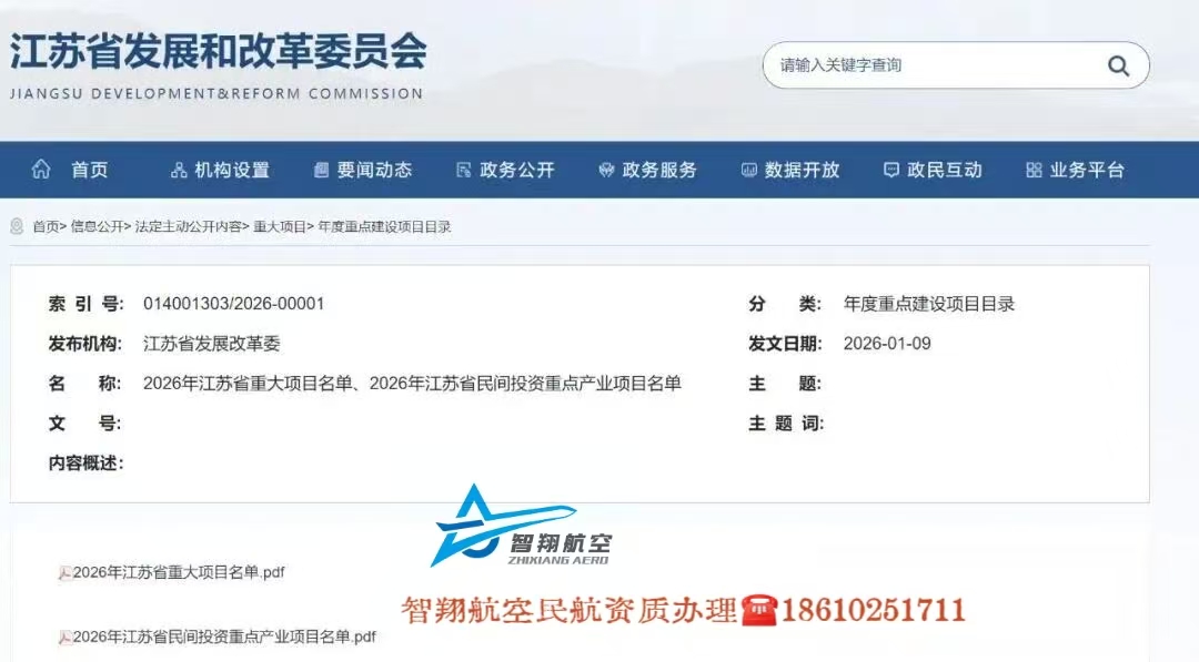 1月9日,江苏省发改委发布了2026年江苏省重大项目清单和省民间投资重点产业项目清单,其中,在《2026年江苏省重大项目清单》中,苏州通用机场新建工程、南通新机场、扬州邗航通用机场、南京禄口国际机场三期工程等在列。