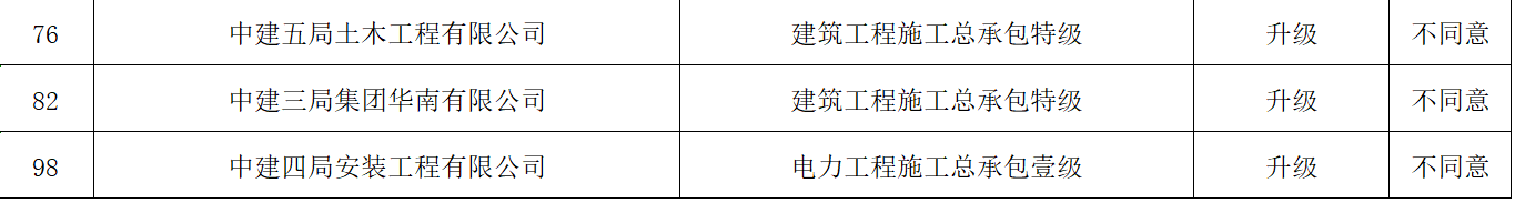 中建五局土木工程公司、中建三局华南公司冲刺的是顶级的“建筑工程施工总承包特级”;中建四局安装公司申请的是“电力工程施工总承包壹级”