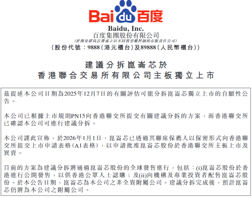 百度昆仑芯的前身是百度智能芯片及架构部,2011年百度就在内部启动了FPGA AI加速器项目。2026年1月1日,百度宣布昆仑芯已向香港联交所提交上市申请。