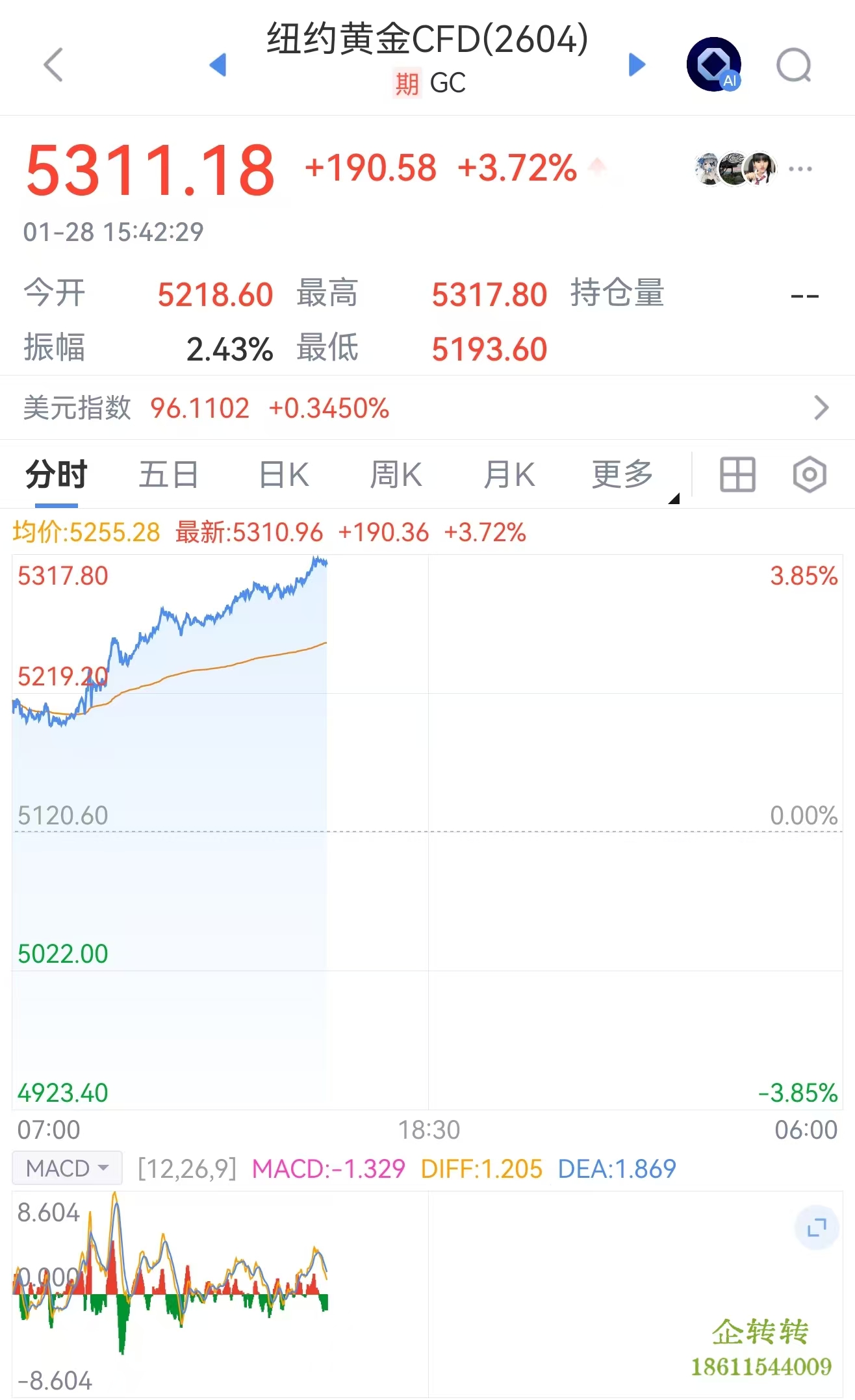据企转转1月28日消息,纽约期金突破5300美元/盎司,日内涨3.53%;现货黄金向上触及5270美元/盎司,日内涨近2%。