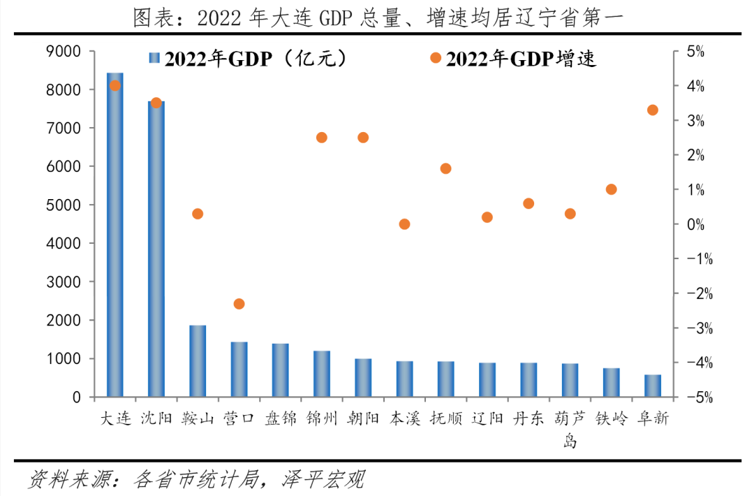 经济实力居辽宁省第一,国家级制造业基地与制造之都。大连作为辽宁省副省级城市,经济总量和增速均超过省会沈阳,2022年,大连GDP总量8430.9亿元,位居全省第一;GDP同比增长4.0%,高于全省实际增速1.9个百分点;人均GDP约11.2万元,居全省第一。2022年,全体居民可支配收入45790元,同比增长3.4个百分点。从产业发展来看,大连的制造业历史悠久,拥有强大的制造业资源和实力,是中国重要的制造业城市之一,大连以石化、装备制造、电子信息和汽车为主导产业,并培育了洁净能源、新材料、医疗健康等战略性新兴产业。