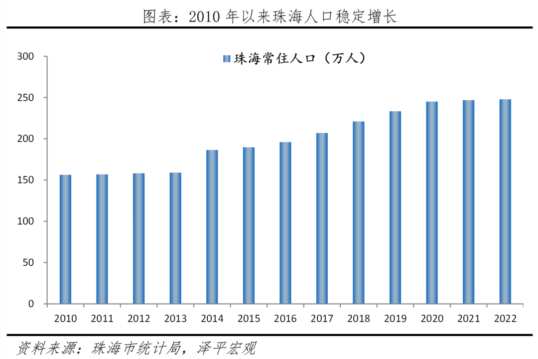 经济特区,港珠澳大桥连接粤港澳大湾区,人才吸引力极强。珠海作为经济特区,吸引了大量外来人口,尤其是年轻人前来就业、创业和生活,珠海常住人口从2010年的156.0万人增长到2022年的247.7万人,增长了58.8%,年均增长率4.9%,体现了珠海强大的发展潜力和人才吸引力。珠海是全国性交通枢纽城市,交通基础设施完善,拥有国际机场、高铁站、港口、高速公路等交通枢纽,还与香港和澳门通过港珠澳大桥陆路直连。珠海的医疗资源丰富,拥有多家三甲医院和专科医院,为居民就业提供高质量的医疗保障。珠海的科教实力卓越,拥有包含北京师范大学珠海分校、北京理工大学珠海学院等在内的高等教育机构,还拥有多个重点实验室和工程技术研究中心。