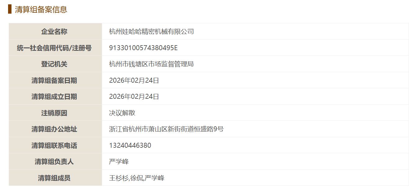 接近娃哈哈精机人士透露,该公司于2026年2月24日发布解散公示并进入解散程序,员工劳动合同2月28日终止。国家企业信用信息公示系统显示,娃哈哈精机正进行债权人公告,注销原因为决议解散,清算组负责人为宗馥莉核心高管严学峰。