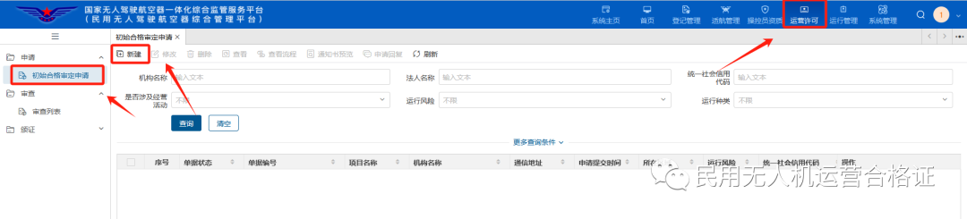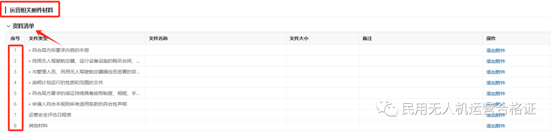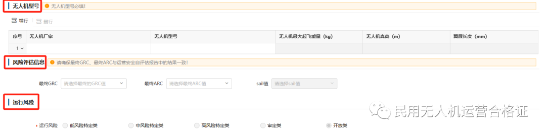 申领/转换指南 1.首先登录企业所注册的UOM系统账号(https://uom.caac.gov.cn) 2.点击“运营许可”菜单,再点击 “初始合格证审定申请”点击“新建”,如下图: 3.填写 “申请人信息”,灰色部分系统自动匹配,剩余部分按照企业实际情况填写 4.填写 “运营信息”,按照企业实际情况进行填写 5.填写 “无人机型号”(必填),多架无人机可点击 “增行” 添加无人机型号; 填写 “风险评估信息”(请确保最终GRC、最终ARC与运营安全自评估报告中的结果一致!) 勾选 “运行风险”,按照企业实际情况勾选即可 6.准备运营相关附件材料 第一部分,资料清单如下: (1)符合局方所要求内容的手册 (2)民用无人驾驶航空器、运行设备设施的购买合同、租赁合同或者协议 (3)与管理人员、民用无人驾驶航空器操控员签署的劳动合同 (4)说明计划运行的性质和范围的文件 (5)符合局方要求的保证持续具备按照制度、规程、手册,实施安全运营能力的运行风险评估报告及测试验证文件 (6)申请人符合本规则所有适用条款的符合性声明 (7)运营安全评估日程表 (8)其他材料 (1)企业工商营业执照 (2)法定代表人身份证明文件 (3)拟申请的经营种类及相关说明材料 (4)材料真实、完整、有效的声明 (5)股东、实际控制人及管理团队合规性声明文件(涉及外商投资) (6)操控员执照信息 (7)操控员的劳动合同证明 (10)无犯罪记录声明 (11)需按照民航局要求取得适航证的民用无人驾驶航空器应提供适航证书 (12)其他材料 准备好文件,添加附件上传 点击下一步提交等待审查。