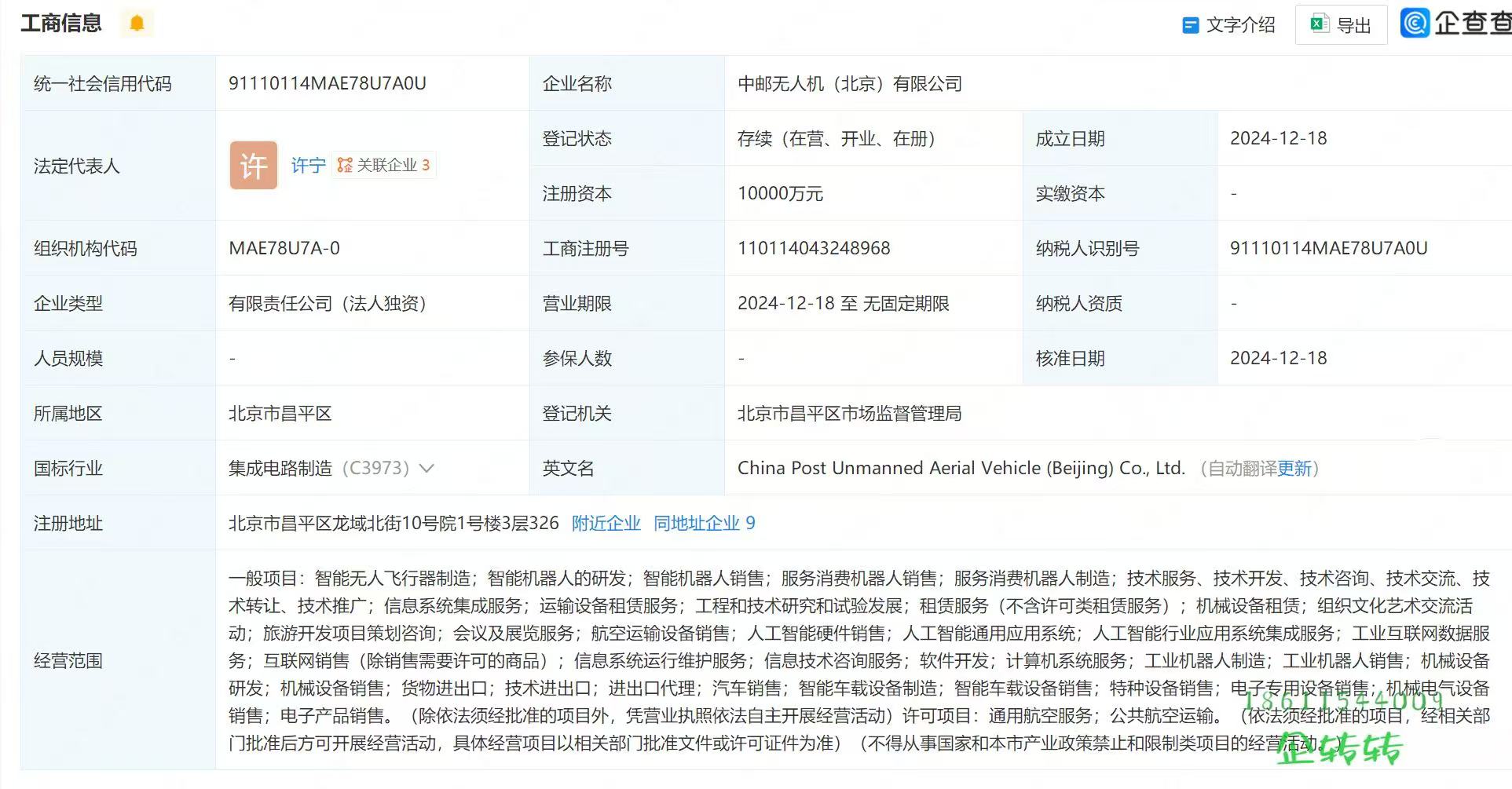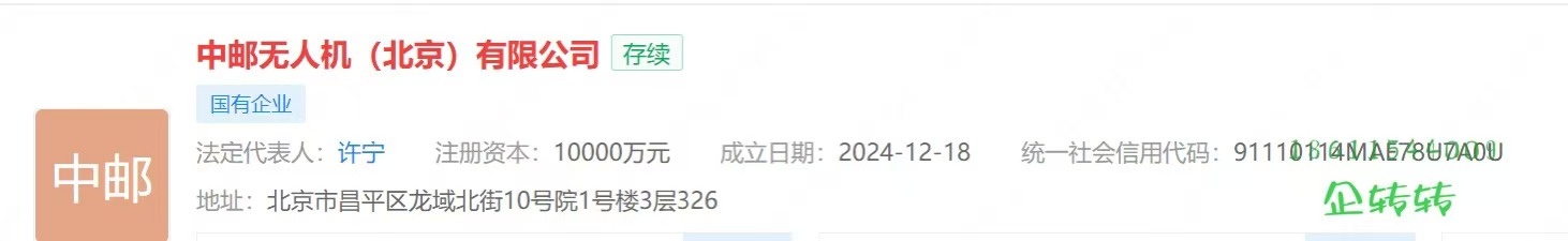 据澎湃新闻消息,企查查App显示,近日,中邮无人机(北京)有限公司注册成立,法定代表人为许宁,注册资本1亿元,经营范围含智能无人飞行器制造、智能机器人的研发、智能机器人销售、人工智能硬件销售、人工智能通用应用系统、人工智能行业应用系统集成服务等,由中国邮政速递物流股份有限公司全资持股。在今年6月,上市公司中信海直旗下海直通航成功中标中国邮政无人机物流配送项目。