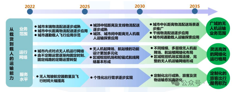 官方“三步走”时间表: 到2025年: 物流先行,在城市短距离物流、支线货运等场景逐步成熟。 到2030年: 网络形成,开始实现有人机与无人机对空域、机场设施等资源的共享。 到2035年: 载人运输,建立载人无人驾驶航空交通运输系统,全面融入国家空域体系。