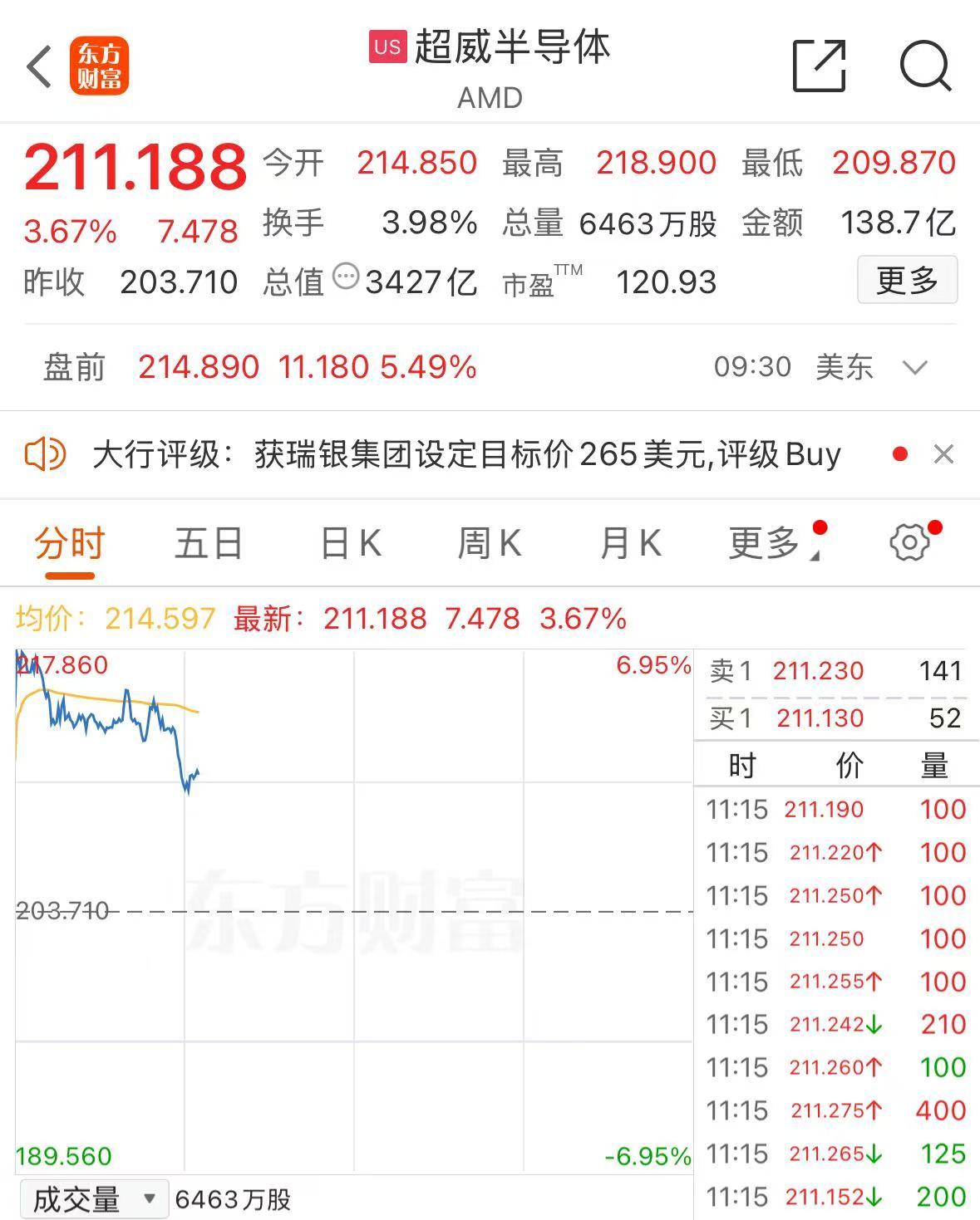 美股芯片股继续走高,AMD在昨天大涨近24%的基础上,再度大涨,盘中一度涨近7%,截至发稿涨超3%。
