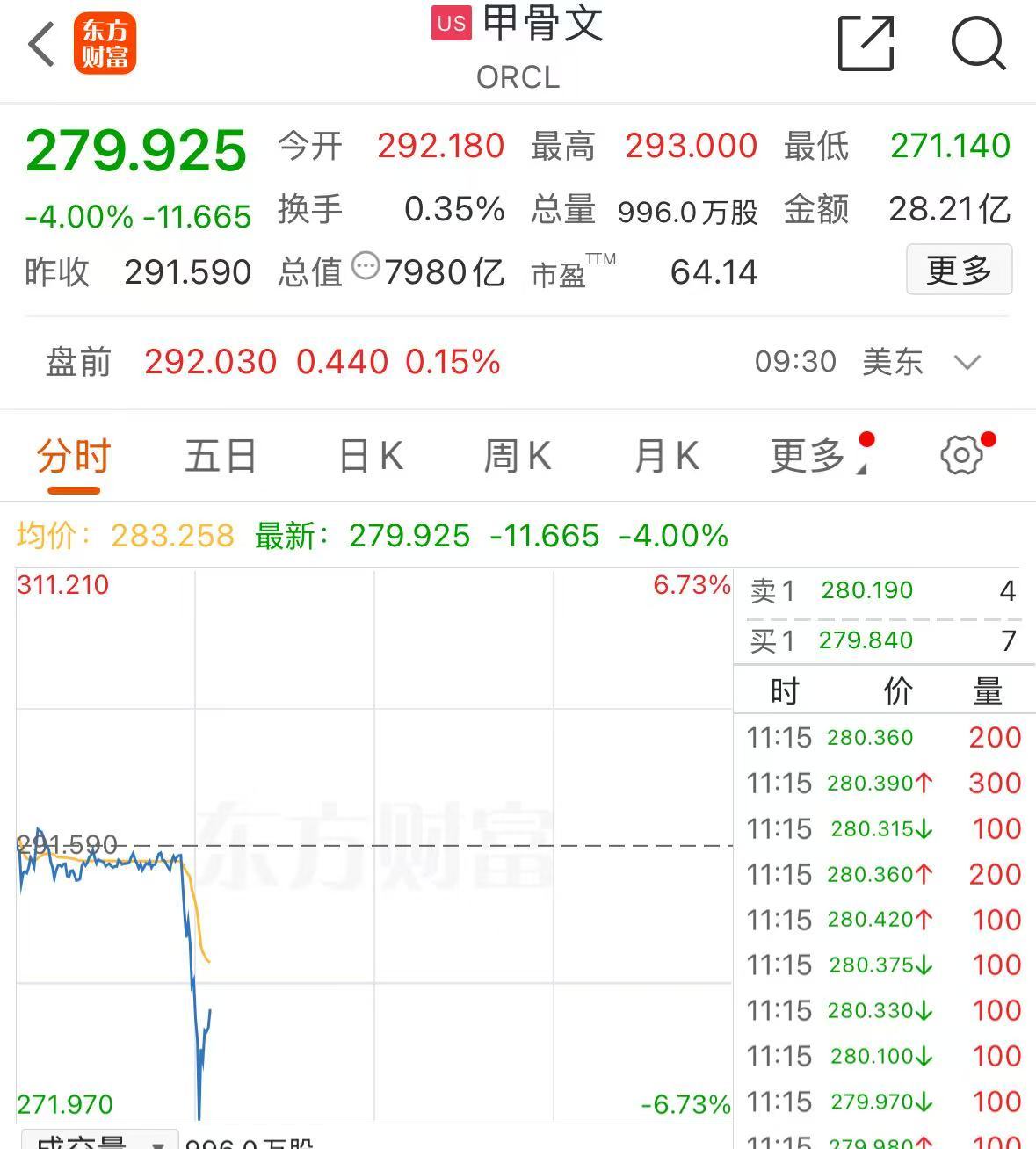 甲骨文公司股价跌幅一度达6.73%,据报道,甲骨文因英伟达blackwell租赁业务损失约1亿美元。
