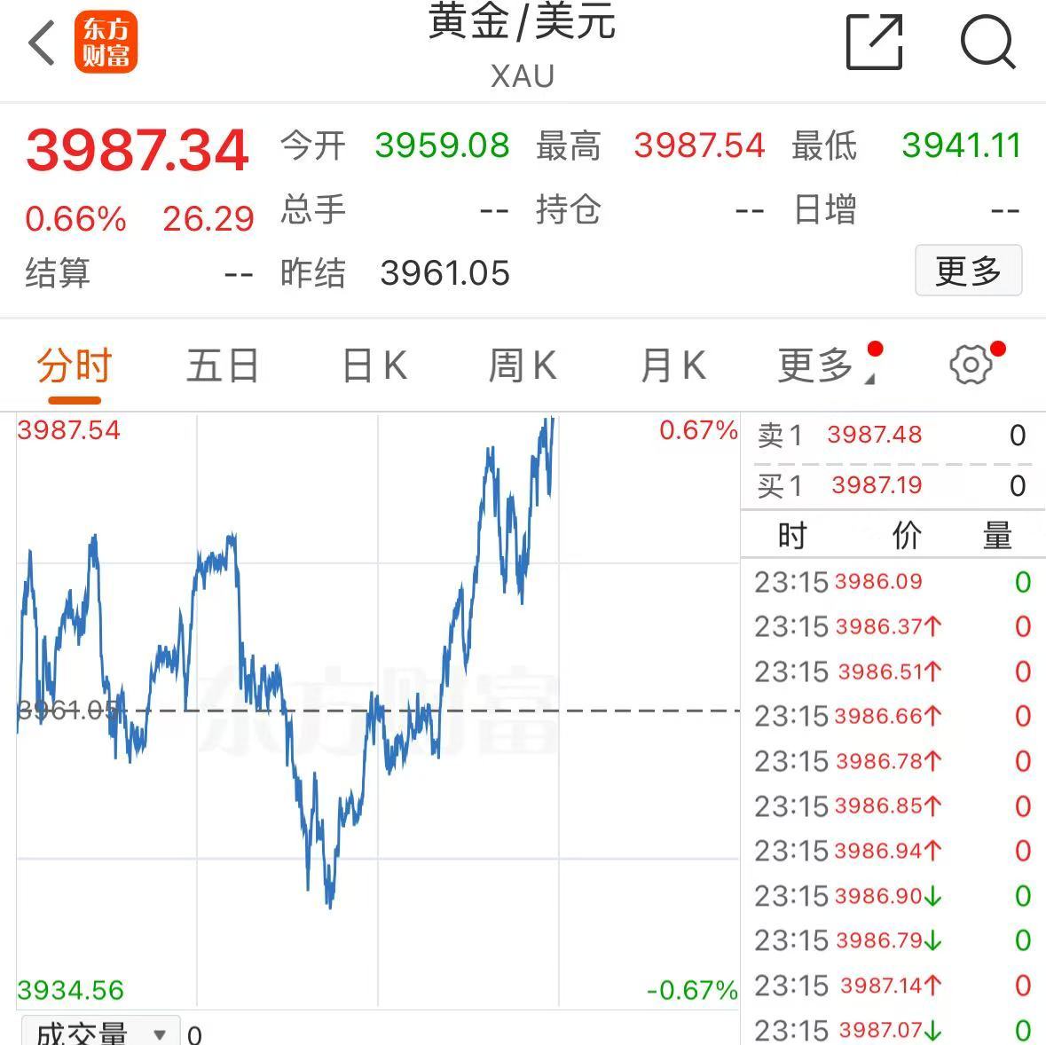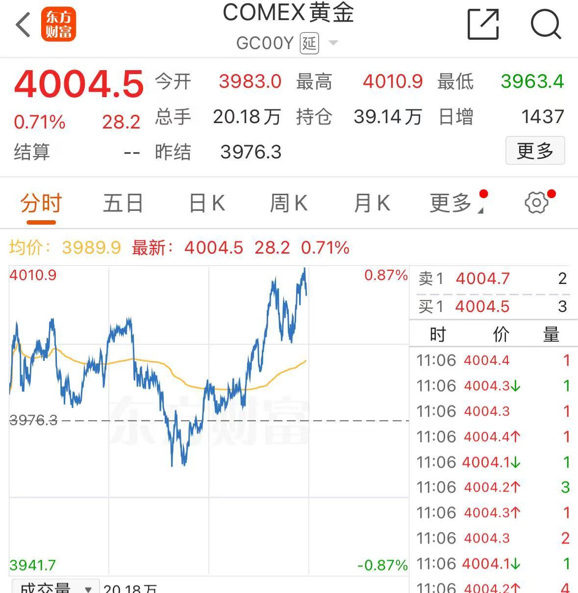 现货黄金一度突破3980美元/盎司,截至发稿报3987美元/盎司,创历史新高。COMEX黄金期货升破4000美元/盎司,盘中最高触及4010.9美元。