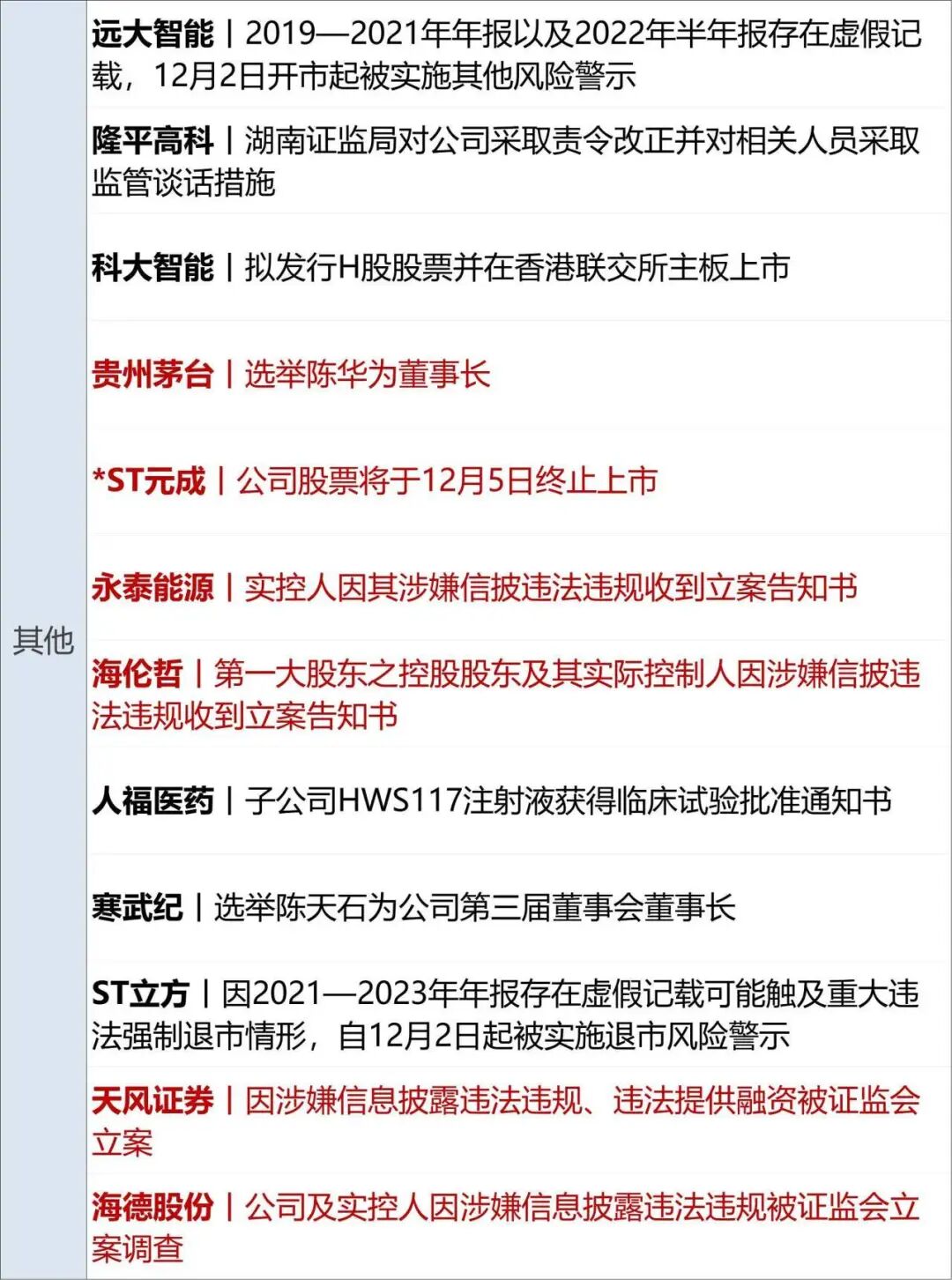 ST立方(SZ300344,股价3.36元,市值21.56亿元):11月28日,中国证监会网站披露显示,近日,中国证监会对上市公司立方数科股份有限公司(简称立方数科)涉嫌定期报告财务数据存在虚假记载作出行政处罚及市场禁入事先告知。经查,2021年至2023年,立方数科通过开展代理业务、融资性贸易、虚假贸易等方式,累计虚增收入6.38亿元、成本6.28亿元。安徽证监局拟对立方数科处以1000万元罚款,对汪逸等10名责任人合计罚款3000万元。立方数科涉嫌触及重大违法强制退市情形,深交所将依法启动退市程序。