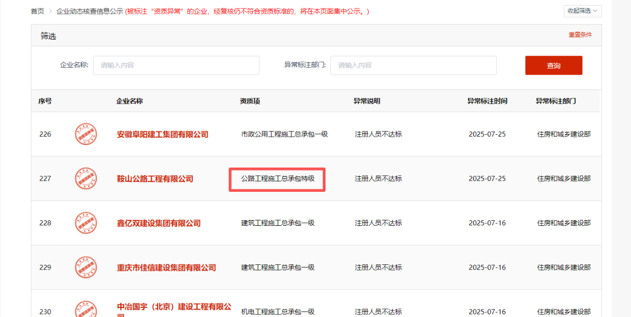 要是发现企业不符合资质标准,就直接在全国建筑市场监管公共服务平台上把你标注为资质异常的状态。