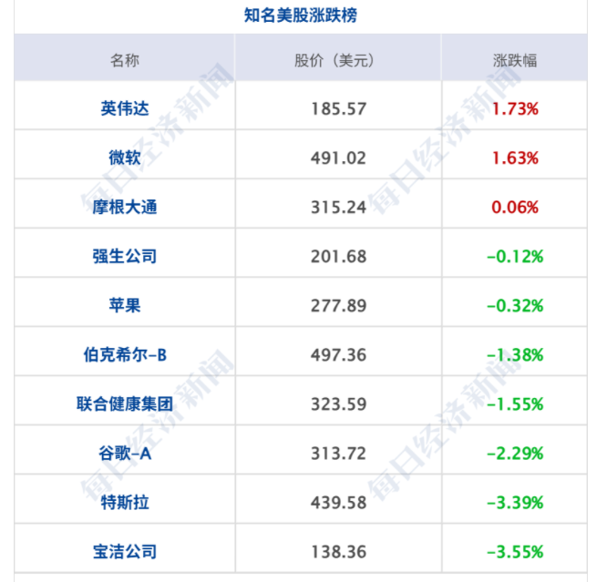 美股三大指数集体收跌,道指跌0.45%,纳指跌0.14%,标普500指数跌0.35%,大型科技股多数下跌,特斯拉跌超3%,谷歌跌逾2%,亚马逊跌超1%,脸书跌近1%,苹果跌0.32%;微软、英伟达涨超1%。纳斯达克中国金龙指数涨0.08%,中概股涨跌不一,高途、世纪互联涨超4%,百度、名创优品涨超3%,小鹏汽车、新东方涨超2%,网易跌超2%,爱奇艺跌近1%。
