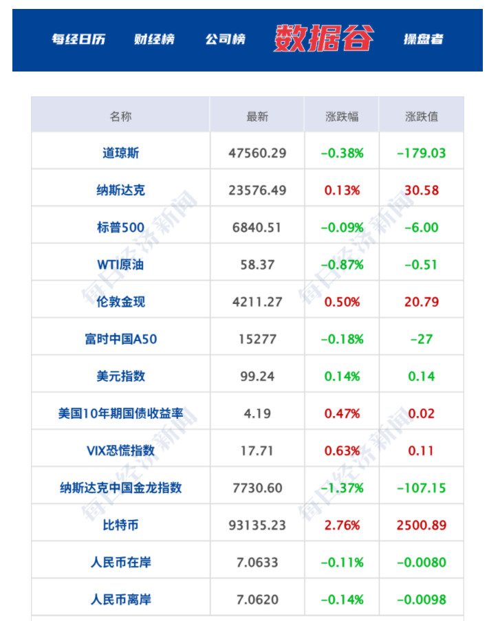 美股三大指数收盘涨跌不一,道指跌0.37%,纳指涨0.13%,标普500指数跌0.09%,谷歌、博通、特斯拉涨超1%,Meta跌超1%;贵金属、加密货币板块涨幅居前,泛美白银涨超11%,Hut 8、金田涨超4%,Strategy涨超2%;生物技术、减肥药、多元化银行板块走低,硕迪生物、摩根大通跌超4%,安进跌超2%,礼来、辉瑞跌超1%。纳斯达克中国金龙指数收跌1.37%,中概股多数下跌,百度跌超4%,小鹏汽车、理想汽车跌超3%,哔哩哔哩跌超2%,蔚来、阿里巴巴跌超1%。