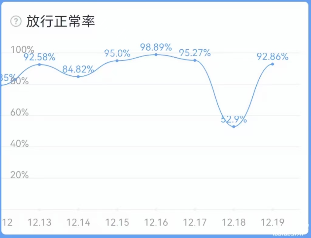 根据飞常准数据显示,12月18日机场整体放行正常率明显较低,仅为53%,大量航班发生长时间延误。