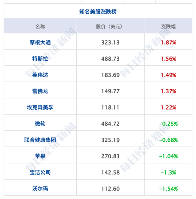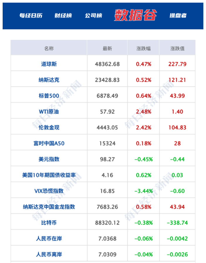 美股三大指数集体收涨,标普500指数涨0.64%,纳指涨0.52%,道指涨0.47%;大型科技股涨跌不一,特斯拉、英伟达涨超1%,谷歌、亚马逊、Meta小幅上涨;英特尔、奈飞跌超1%,苹果、微软小幅下跌;第一太阳能涨超6.6%,创2024年6月份以来收盘新高;花旗集团涨近3%,股价创17年多新高。纳斯达克中国金龙指数涨0.58%,中概股多数上涨,爱奇艺涨近3%,小马智行涨超2%,哔哩哔哩涨1.57%,京东涨近1%,金山云跌1.5%。