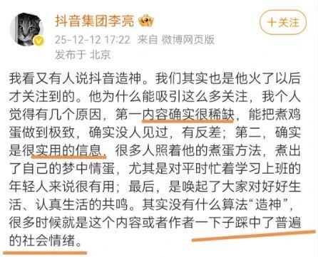 有网友质疑他火得莫名其妙,怀疑是抖音在造神。抖音副总裁李亮否认此说法,并称也是火了之后才注意到。