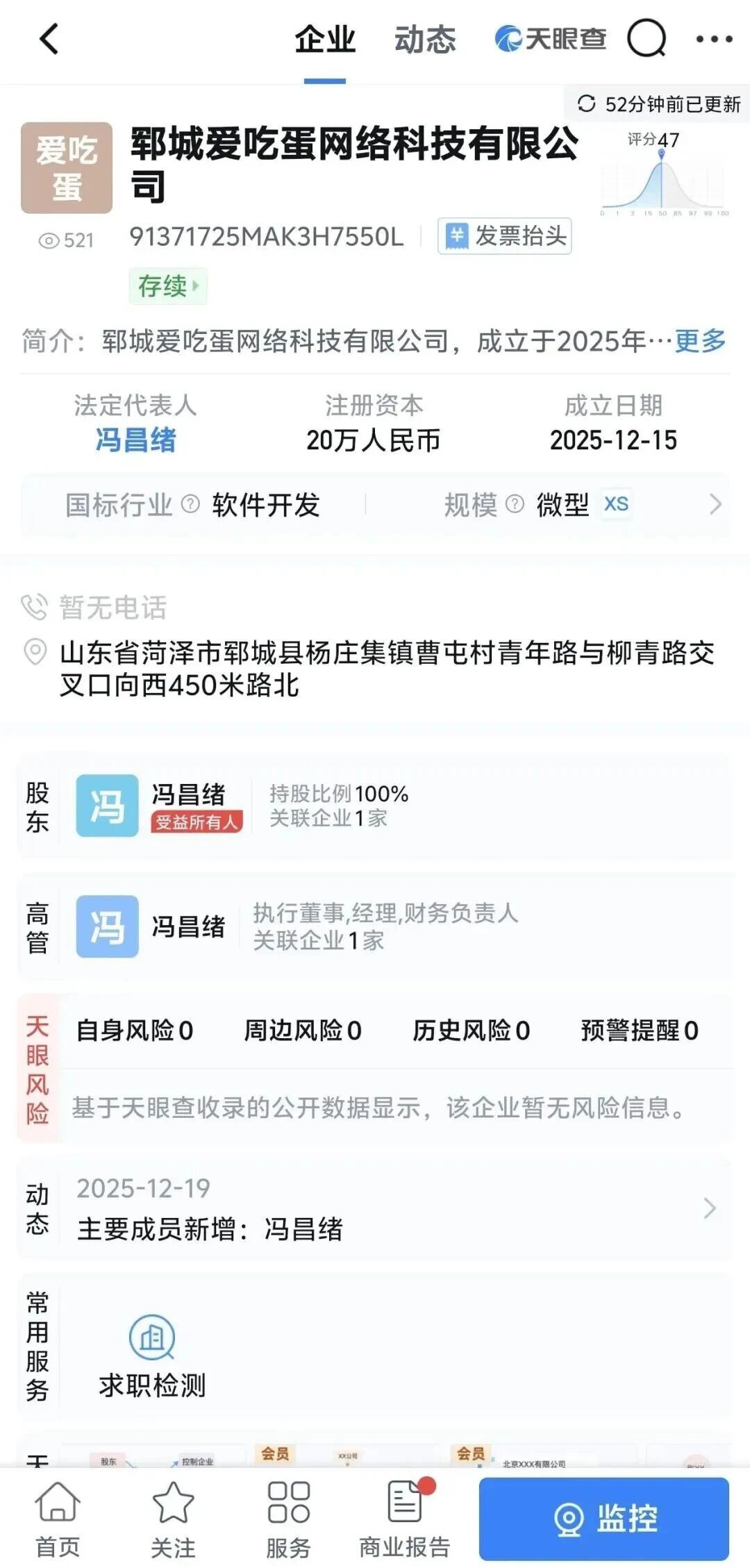 “要在爆火的时间里抓紧变现”,这句话说得不假。天眼查信息显示,近日,抖音百万网红蛋神注册“郓城爱吃蛋网络科技有限公司”,注册资本达20万元,由其100%持股,经营范围包括互联网销售、直播技术服务等。