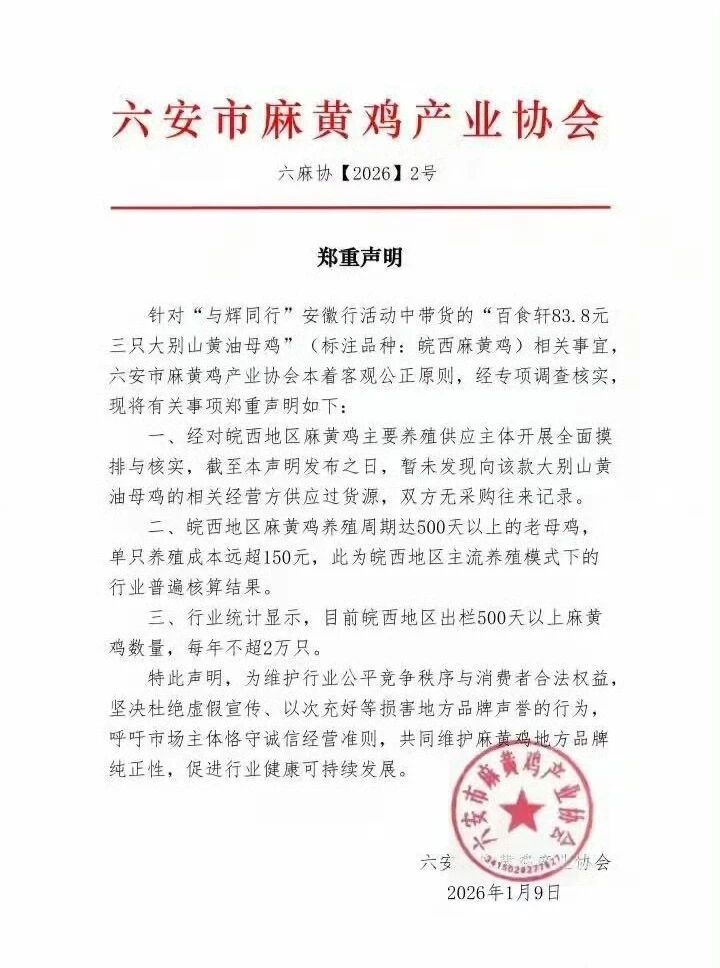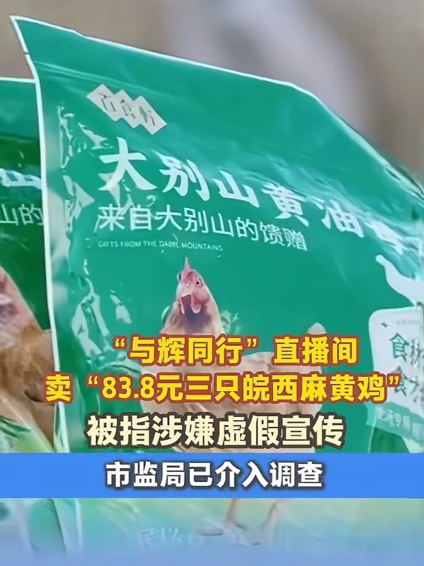 最近,“与辉同行”直播间的一款“83.3元三只大别山黄油母鸡”,引发行业质疑。
