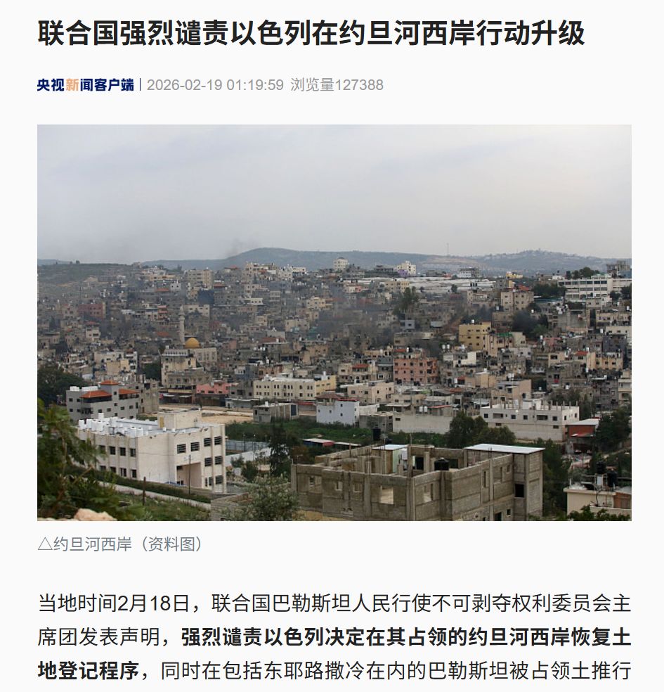 央视新闻报道,当地时间2月18日,联合国巴勒斯坦人民行使不可剥夺权利委员会主席团发表声明,强烈谴责以色列决定在其占领的约旦河西岸恢复土地登记程序,同时在包括东耶路撒冷在内的巴勒斯坦被占领土推行众多其他非法政策和做法。这些非法措施可能进一步剥夺巴勒斯坦土地所有者的权利,并加剧以色列对被占领土的非法控制。
