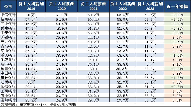 A股上市的银行中,人均年薪48万以上的,都有小幅下降,而人均年薪低于40万的,大多数还有小幅上涨: